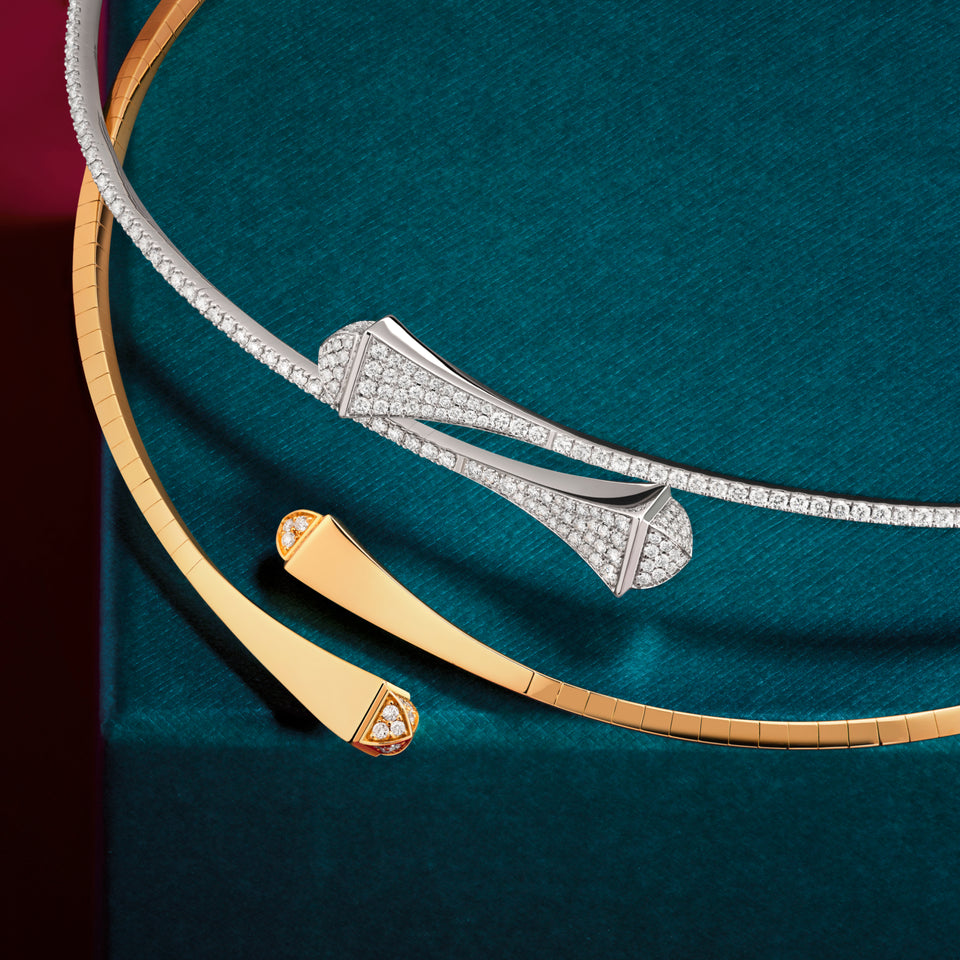 Designed to enhance the elegant shape of every neckline while illuminating the visage, we propose innovative necklaces with zippers allowing you to choose the length of the chains, pendants featuring revolutionary movements, dancing diamonds of different shapes, and colorful stones or full diamonds collars.