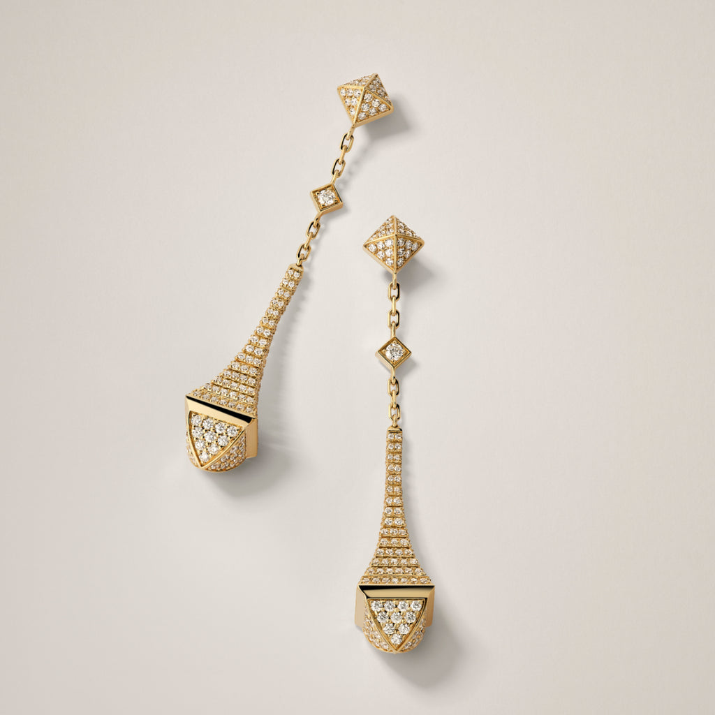 The Cleo Collection is a bold expression of modern power, timeless femininity, and architectural elegance. As the brand’s signature line, Cleo is instantly recognizable for its striking pyramid-shaped motifs, a nod to Cleopatra, the original icon of strength, allure, and unapologetic grace.